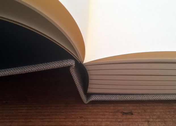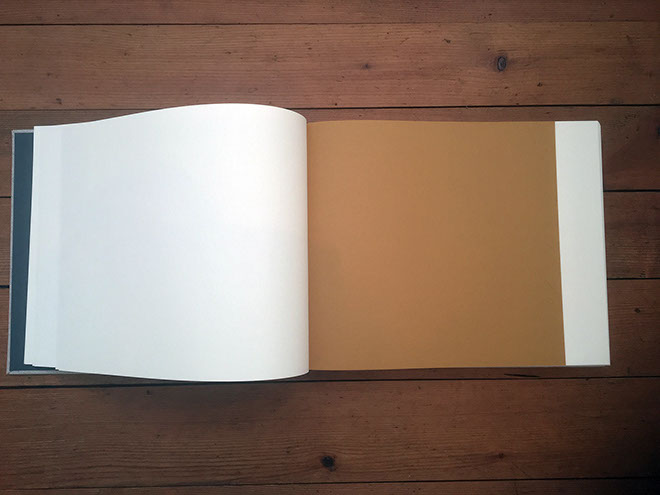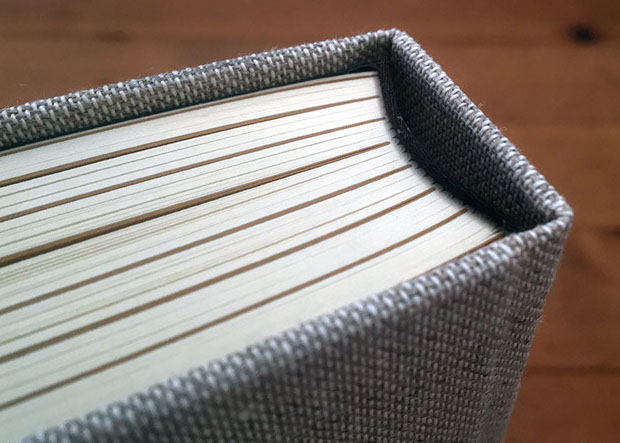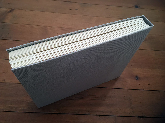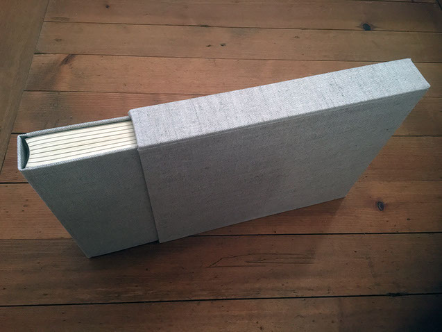 Handgebundes Buch mit Leineneinband, eingelegten farbigen Papieren und handgefertigtem Schuber.